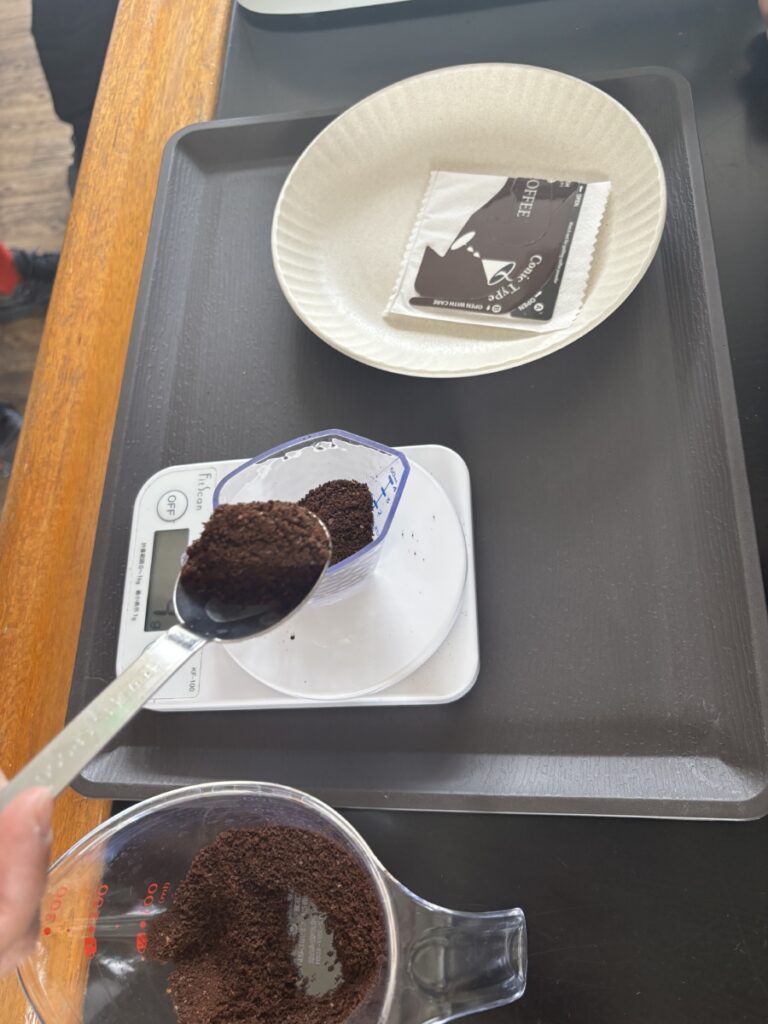 焙煎後に出たチャフをふるいにかけ取り除きミルをして挽きたてのコーヒーを試飲しました。
