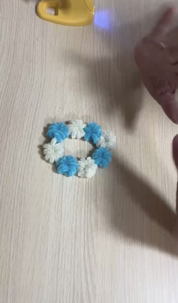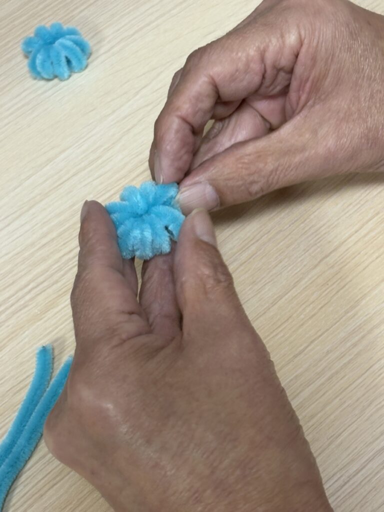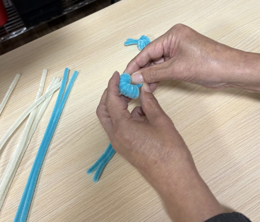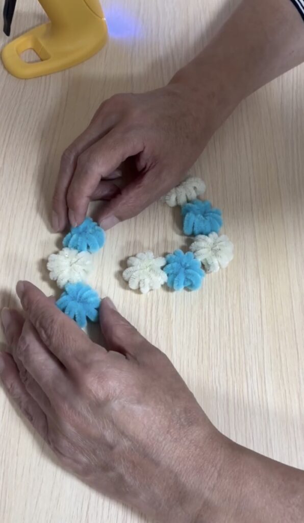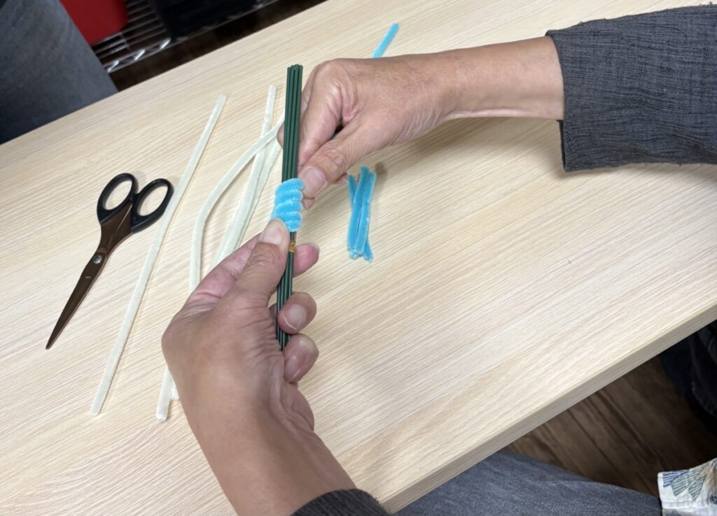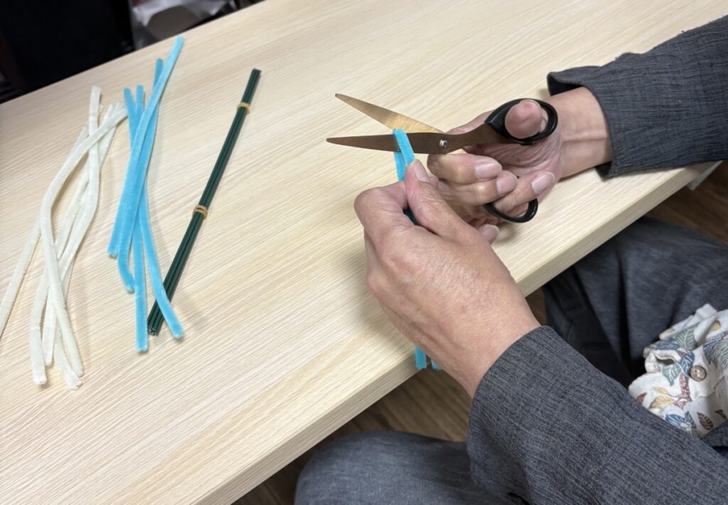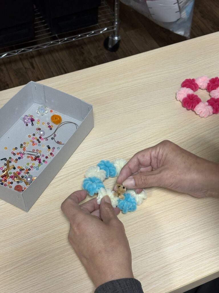ワンちゃんリースを利用者様が制作してくださいました。今回はリースの部分を作ってくださったのですが切ったり巻いたりくっつけたりして可愛いリースが完成しました。