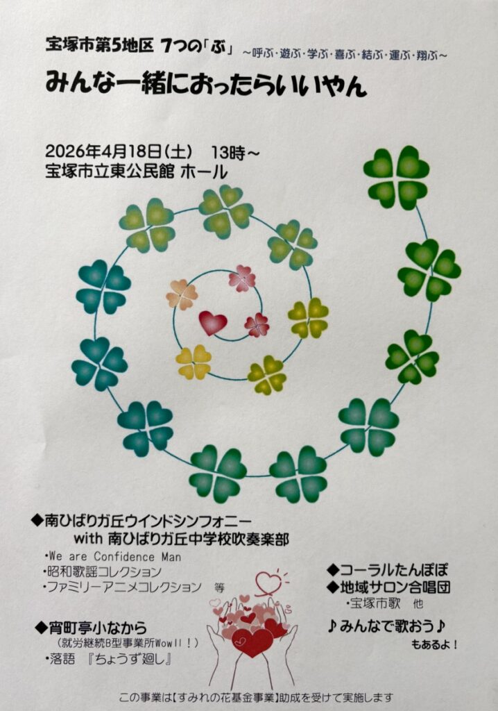 🍀4月18日(土)13時開演 イベント名【みんな一緒におったらいいやん】出演のお知らせ 宝塚市立東公民館🍀